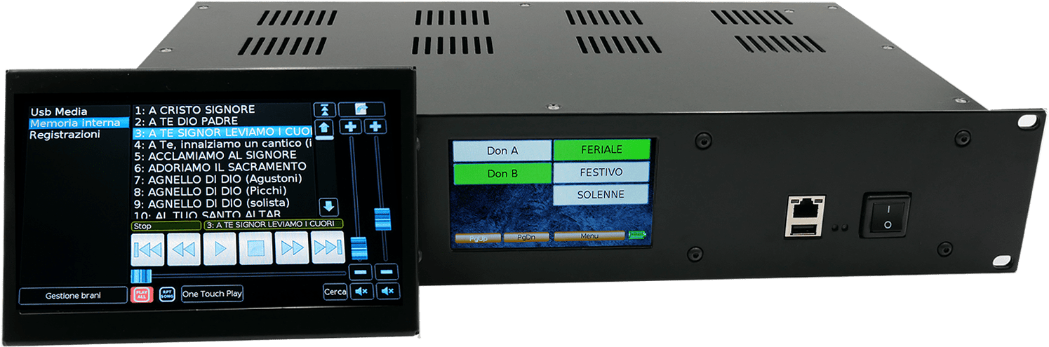 E-mix primary controls are accessible from the 4.3” touch-screen display integrated into the device. A 7” touch-screen display can be installed, as an option, via LAN cable. The editor with advanced features is available by connecting via PC.